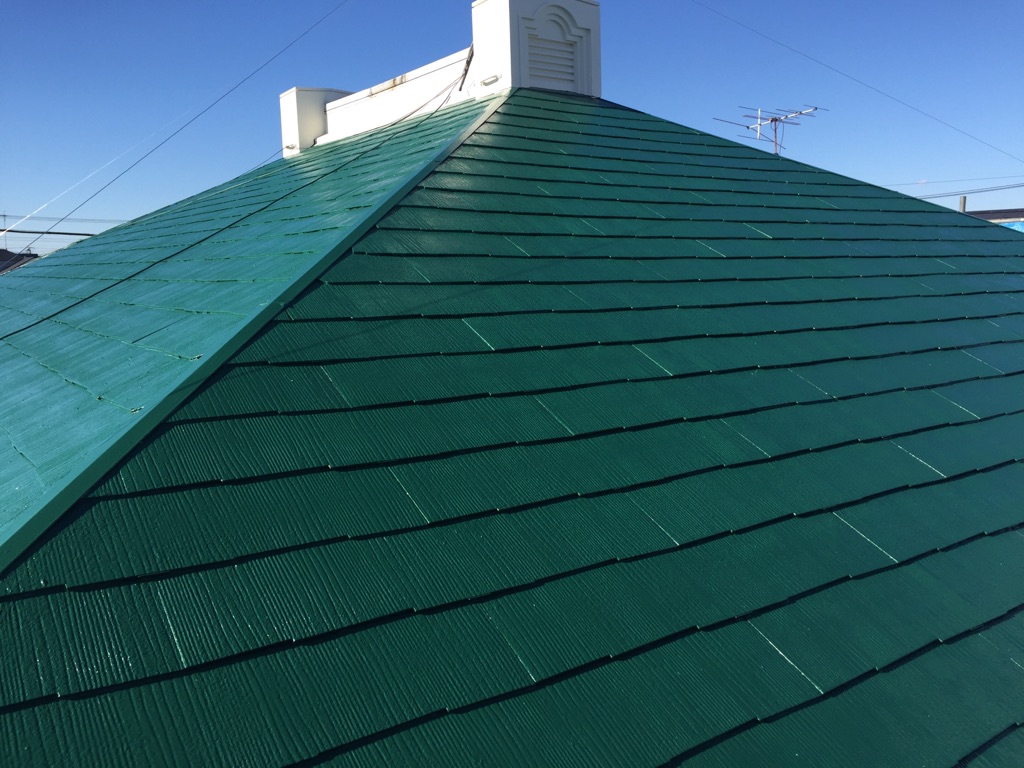 コロニアル屋根の中塗り、上塗り塗装。 ヤネフレッシュRC114にて。