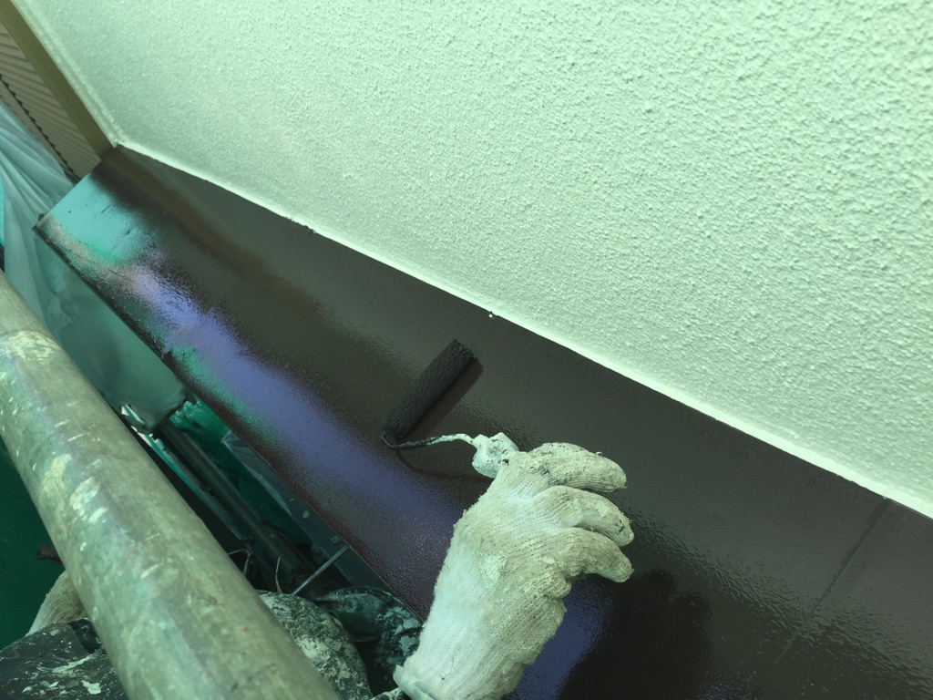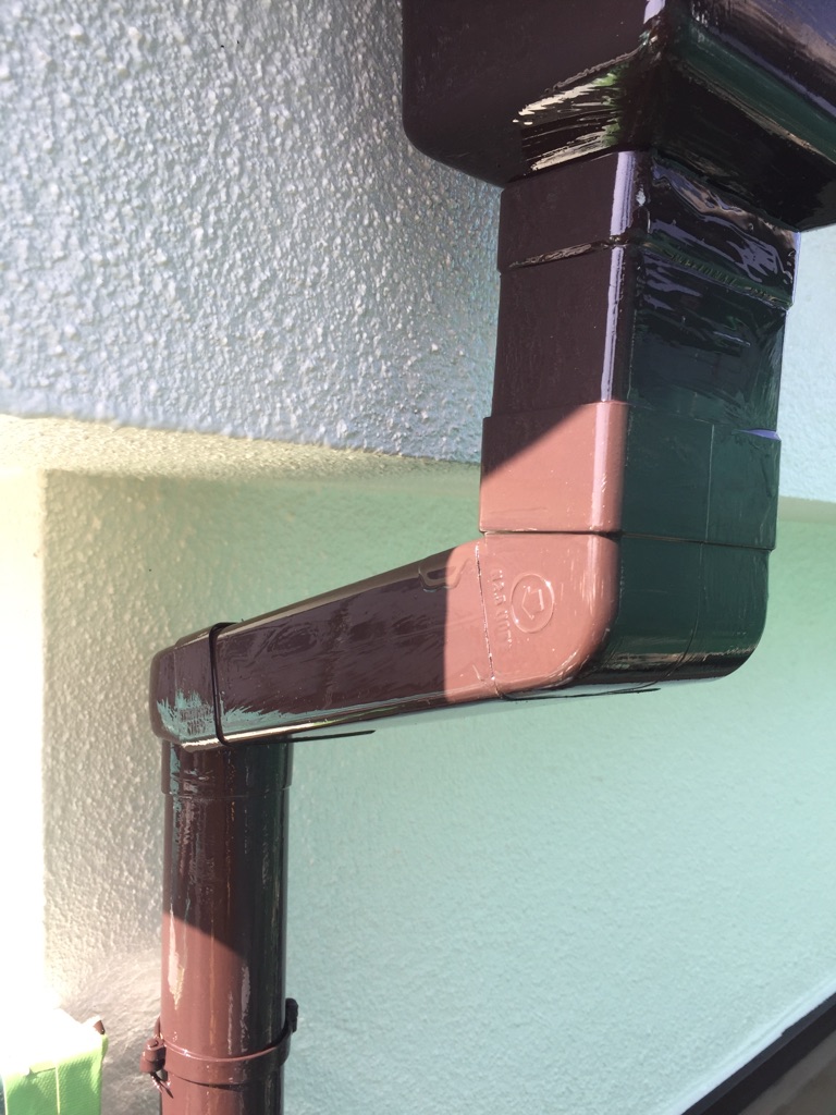 雨樋、トタン霧除けの塗装 マイルドシリコン ココナツブラウン色にて塗布。