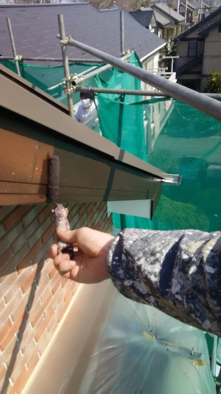コロニアル屋根及び破風板へのプライマー塗布作業。