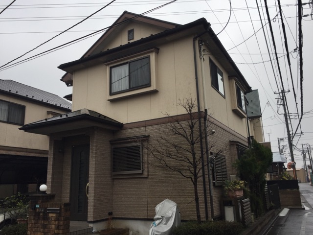外壁上部はセラミシリコン 色番号SR410。 下部はサイディング用クリアー仕上げ。