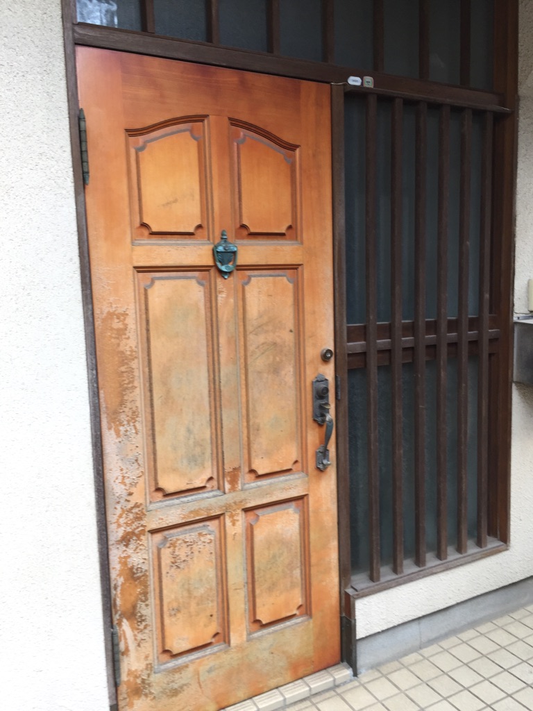 玄関ドアも剥離しており傷んでいます。