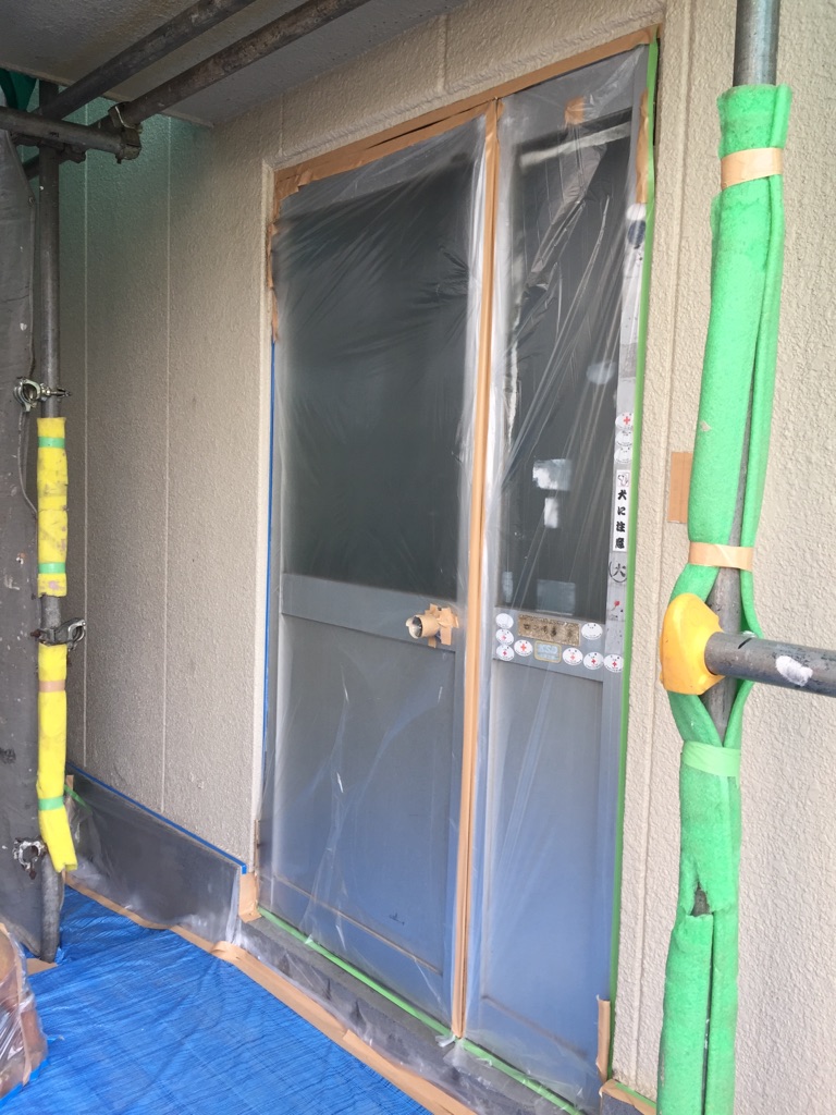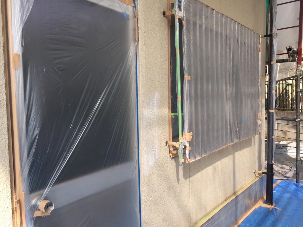 外壁養生作業。