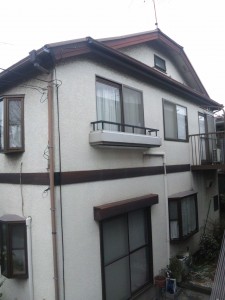 15年程何もしていないようでした。外壁はリシン壁でかなり黒ずんで傷んでおります。屋根はコロニアルでやはりコケや藻が発生しております。今ではめずらしく破風板、帯はプリント板になっておりますので汚さないように注意します。