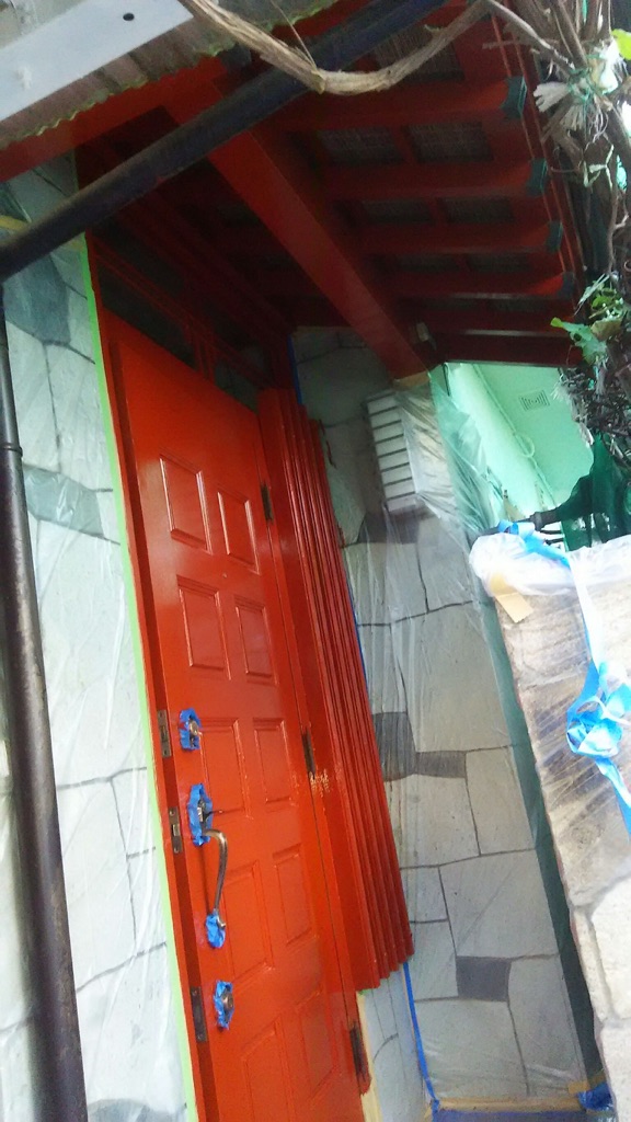 玄関母屋等の上塗り塗装。マイルドシリコン 赤さび色にて施工。
