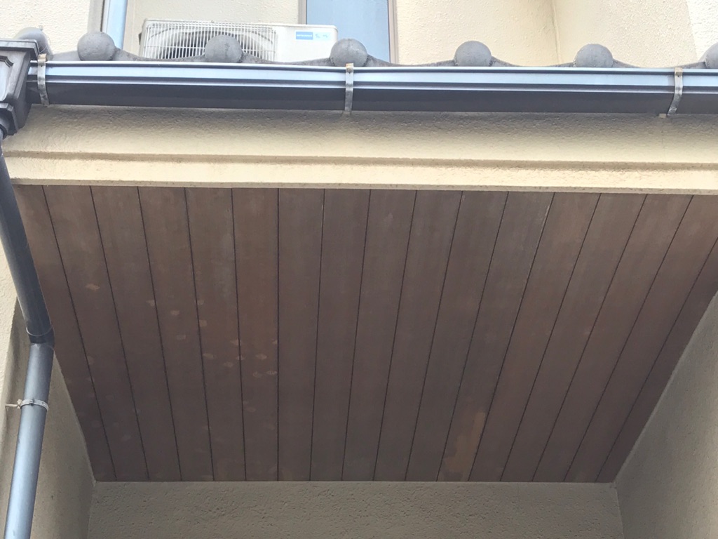また、玄関の軒天はクリアー仕上げになっておりますが、クリアーが所々はげています。補修するのが難しく、今回はマイルドシリコンにて塗りつぶしにいたします。