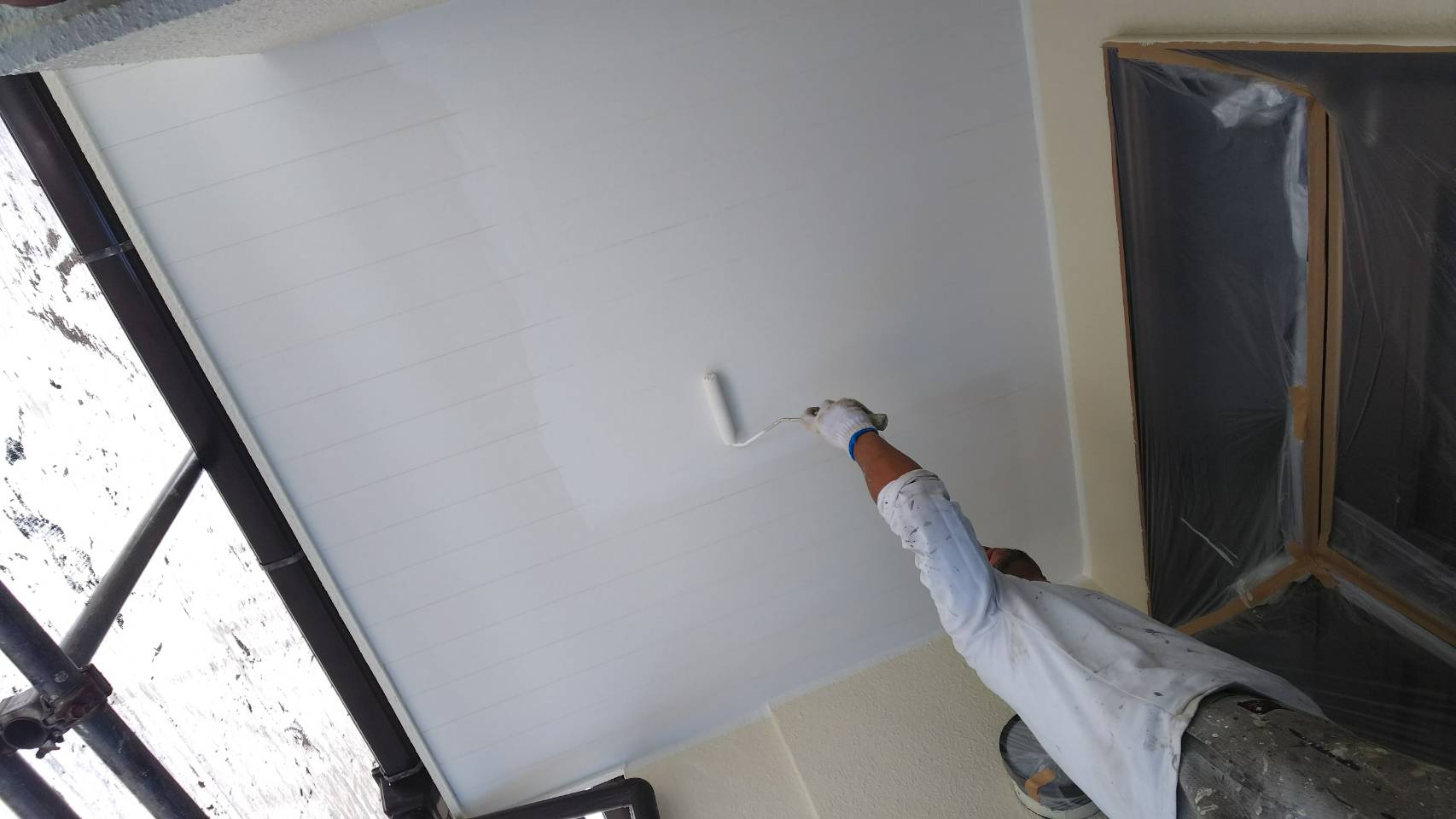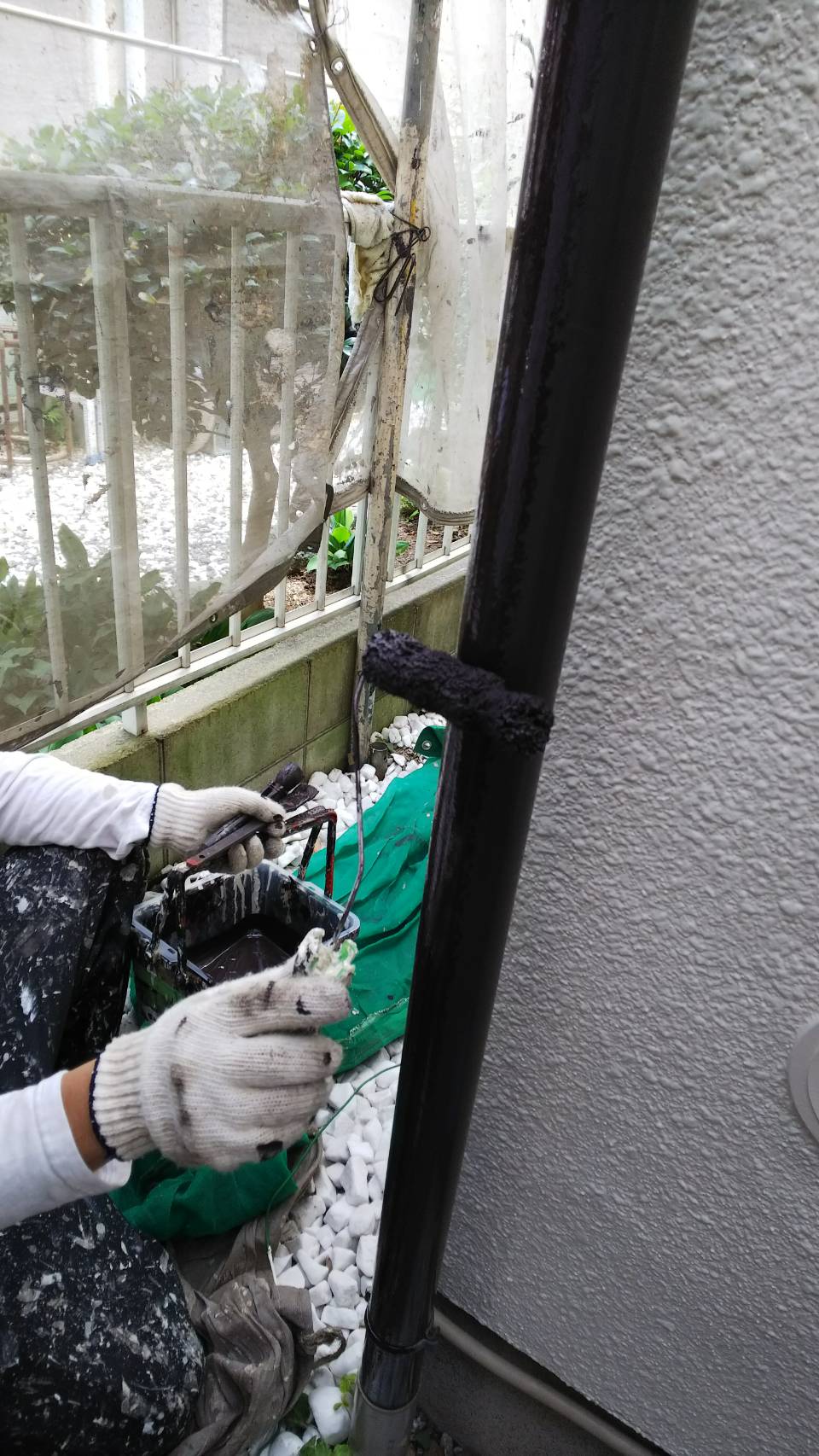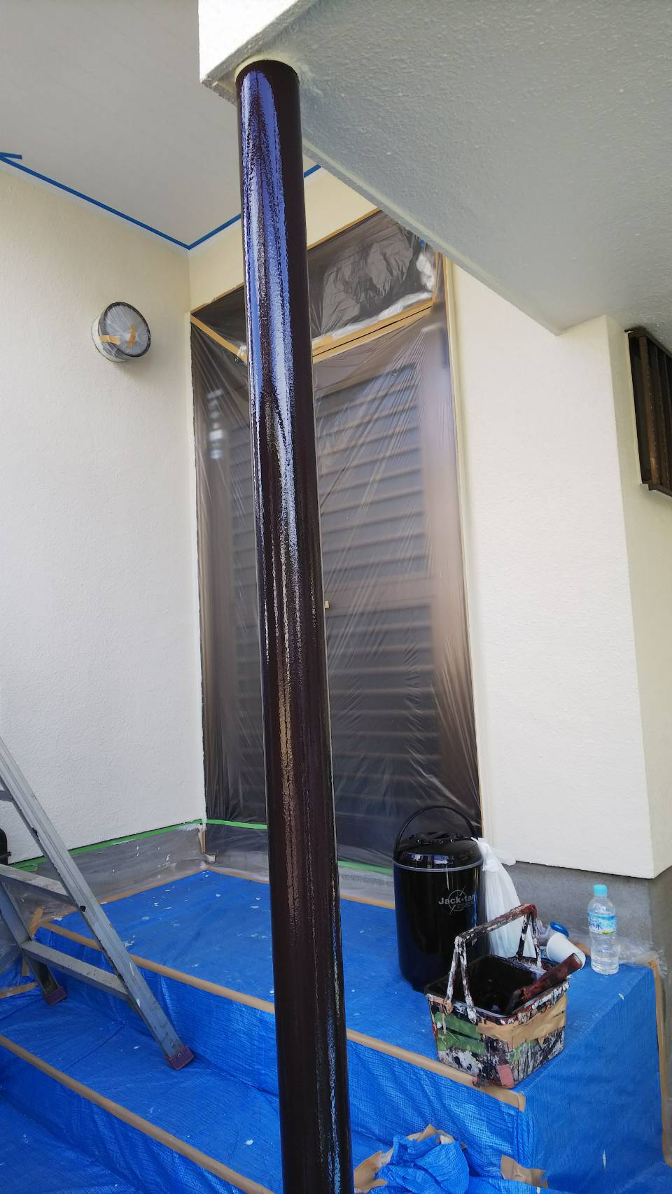 養生を外しながら、雨樋 トタン部 鉄骨部分の上塗り塗装。マイルドシリコン ココナツブラウン色にて施工。