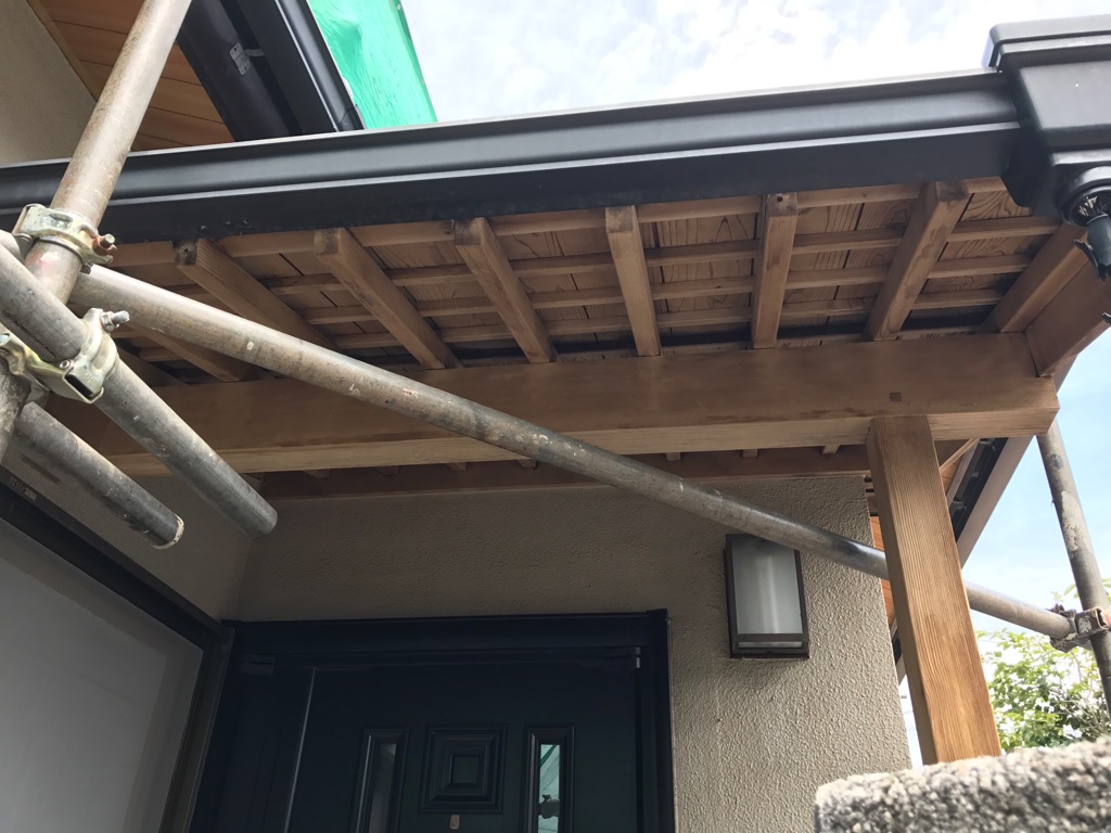 玄関軒天の漂泊作業。2回薬剤を使用して洗い、水洗いの作業です。