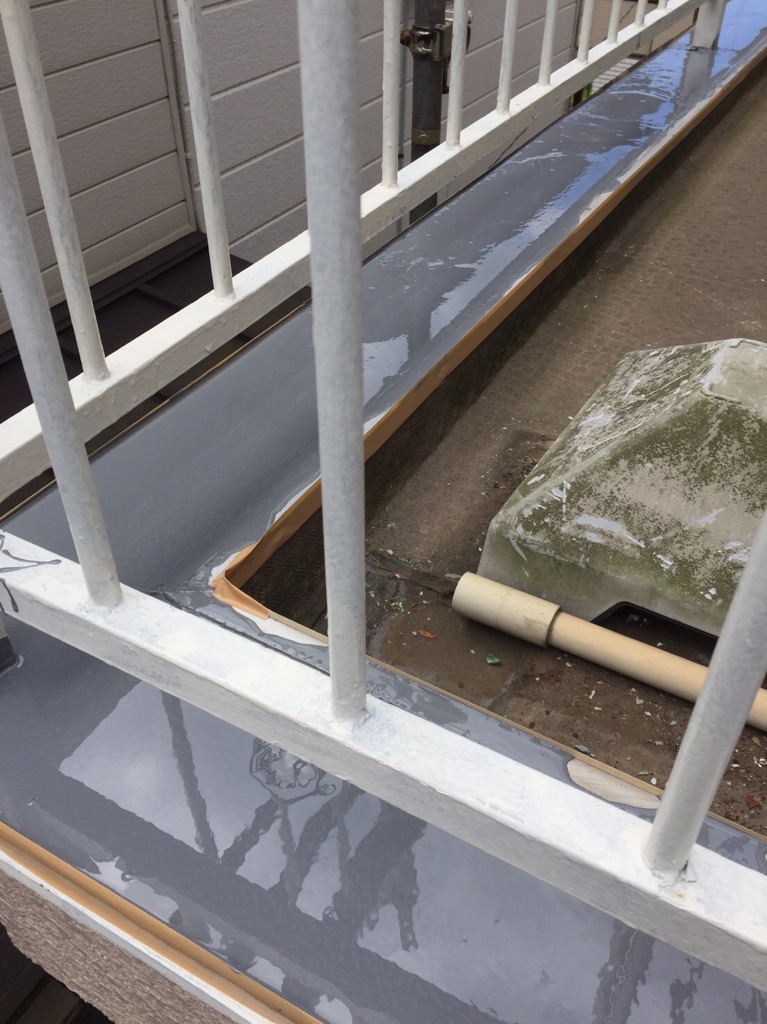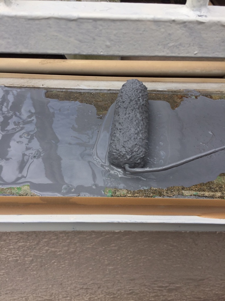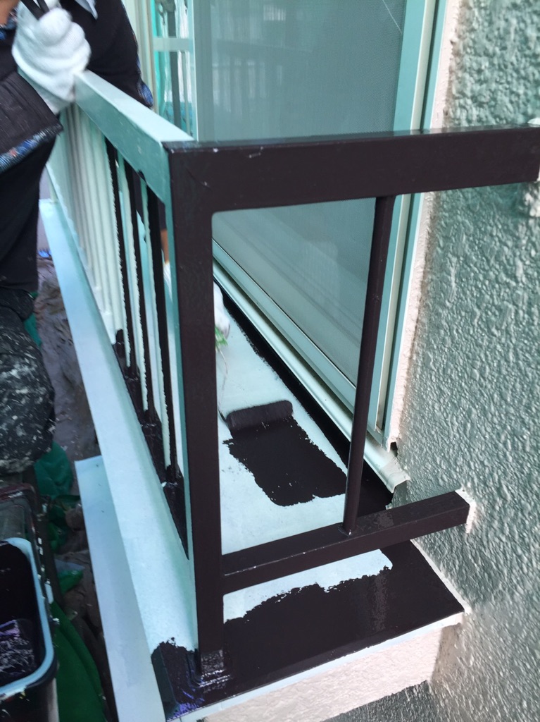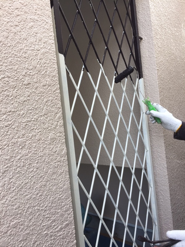 ベランダ鉄骨手すり、駐車場格子、及びトタン霧除け マイルドシリコン ココナツブラウン色塗装。