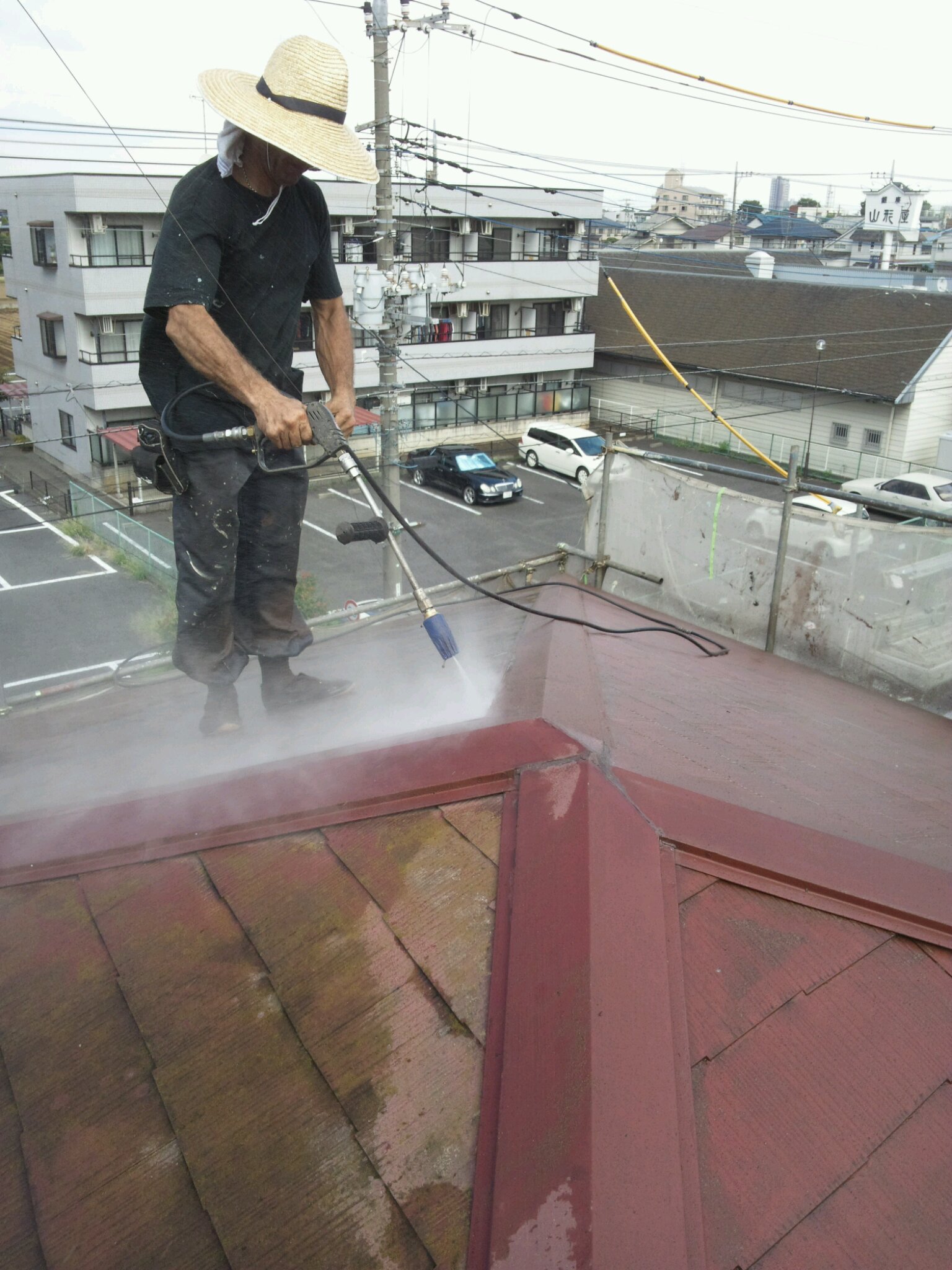 続いて高圧洗浄ですが、作業方法でご紹介した通り、屋根がかなりコケや旧塗膜の剥がれが激しいので、入念に落としていきました。