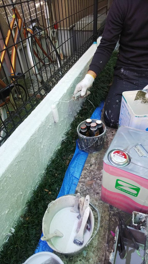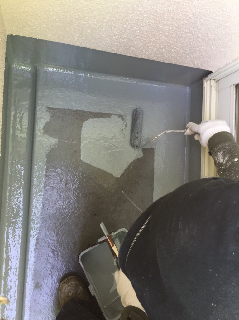 ベランダ及び玄関庇上 現防水部分の プライマー塗布、トップコート塗装。