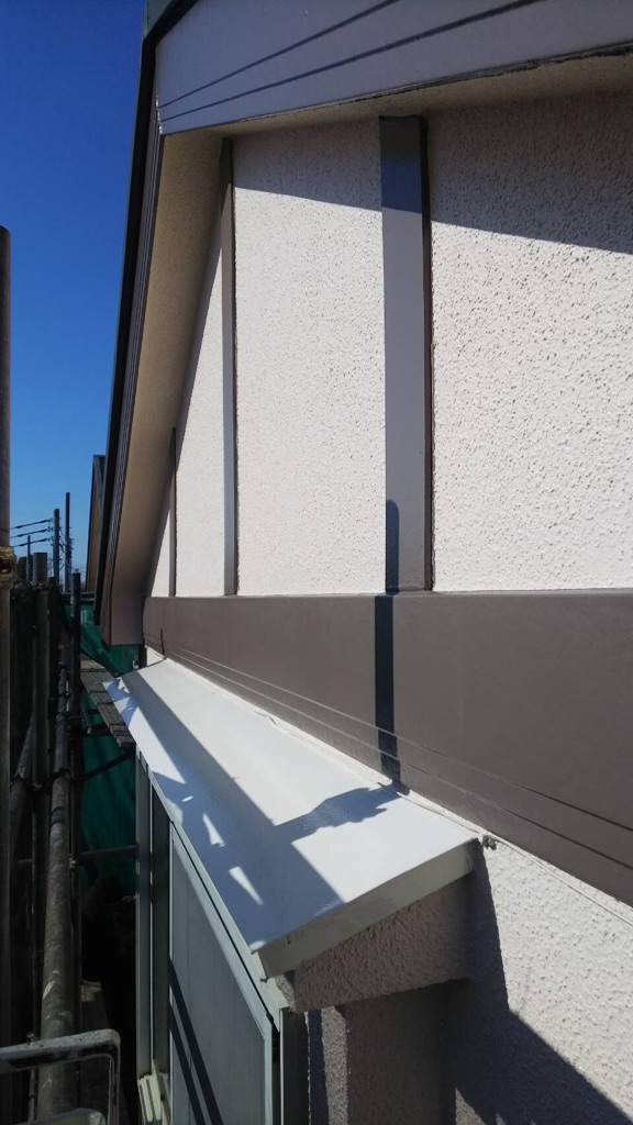 養生を外しながらボーダー部分及び雨樋の塗装。