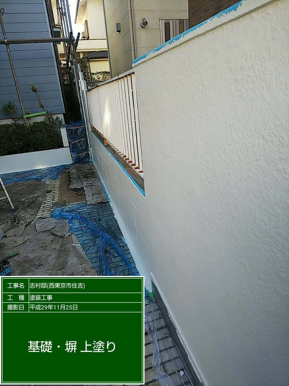塀の下塗りフィーラー塗装。中塗り及び上塗り塗装 ダンシリコンセラND105にて塗布。