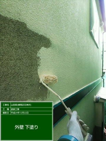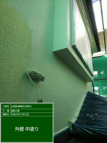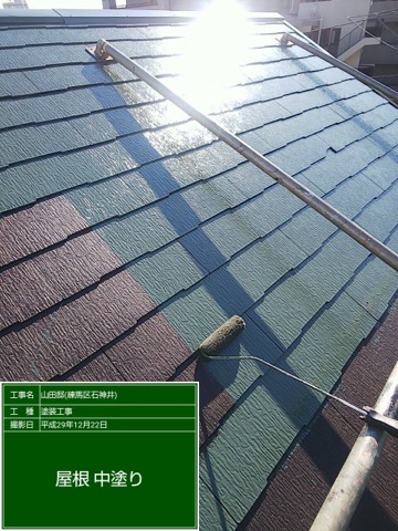 コロニアル屋根 中塗り塗装 ファインシリコンベスト ボローニャグリーン色 塗布作業。