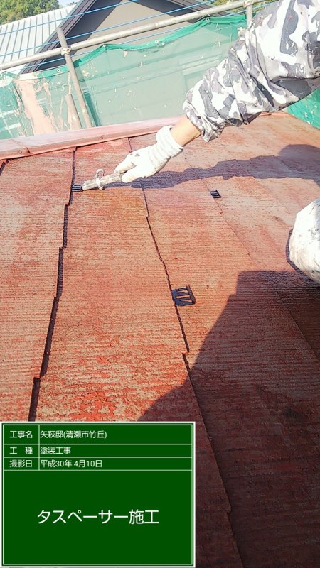 コロニアル屋根へタスペーサー挿入作業。