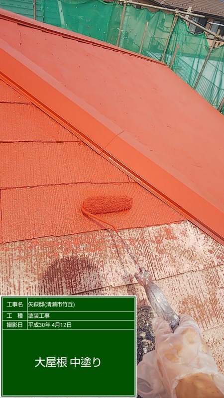 コロニアル屋根中塗り ヤネフレッシュ マルーン色塗装。