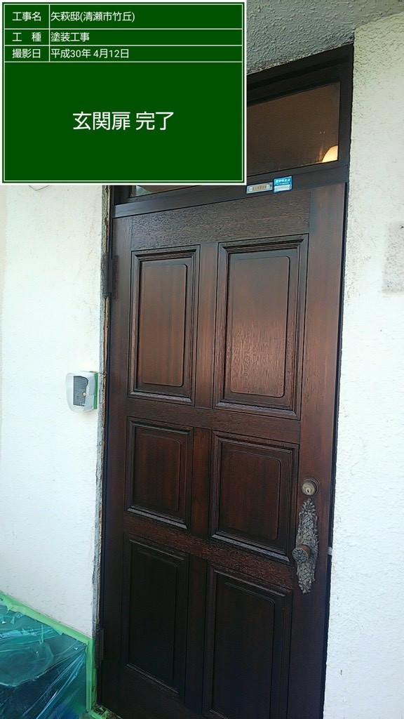 玄関ドアの中塗り及び上塗りクリアー吹付塗装。