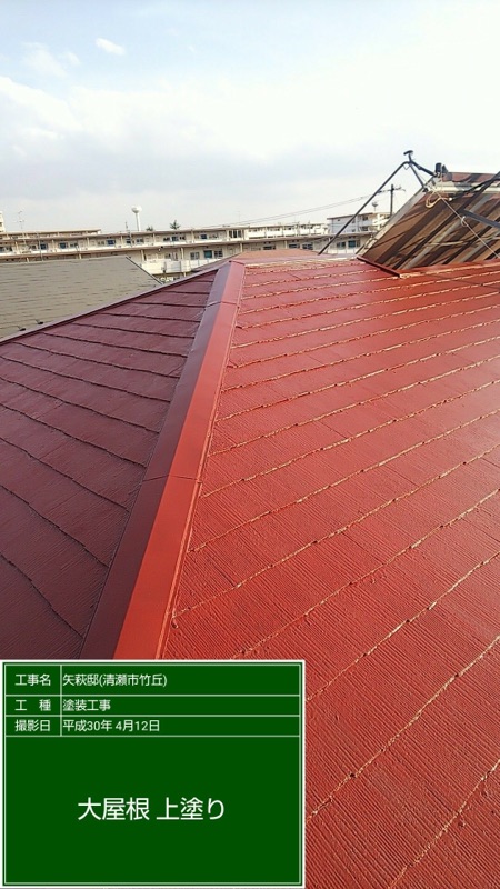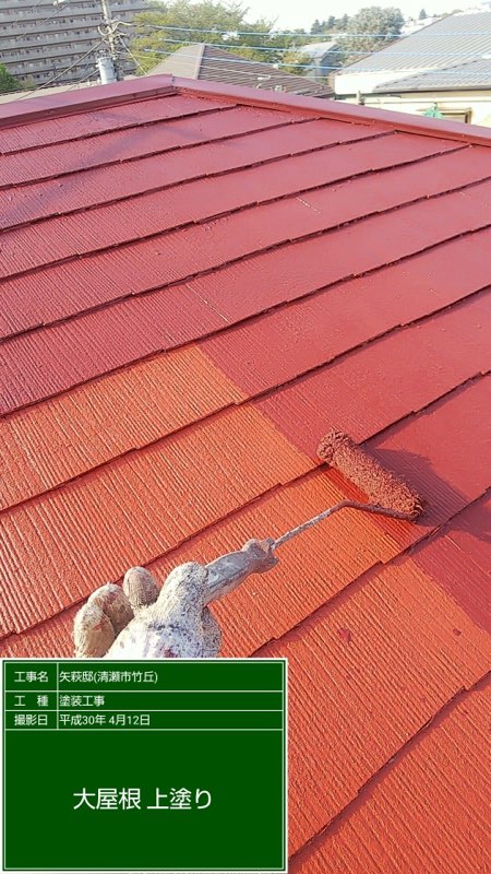 コロニアル屋根の上塗り塗装。ヤネフレッシュ マルーン色。