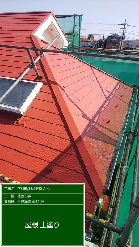 コロニアル屋根は サーモアイ(遮熱塗料)ローマオレンジ色 中塗り、上塗り塗装。