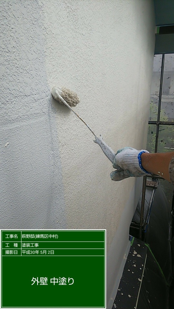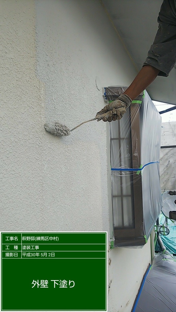 外壁 下塗りフィーラー塗装。中塗りダンシリコンセラ 色番号ND108。