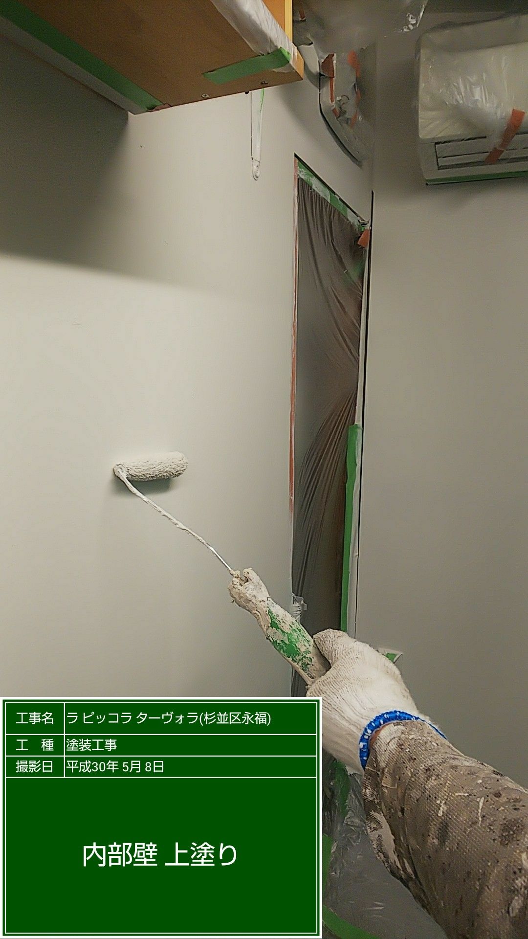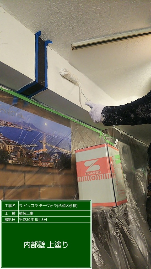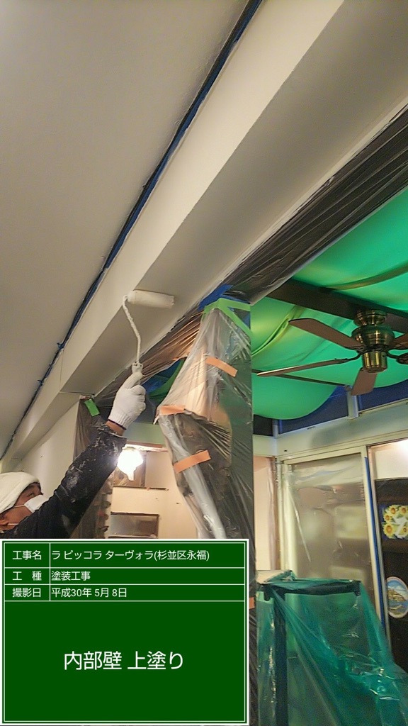 壁の中塗り及び上塗り塗装。アートフレッシュ 色番号AC1002塗装。