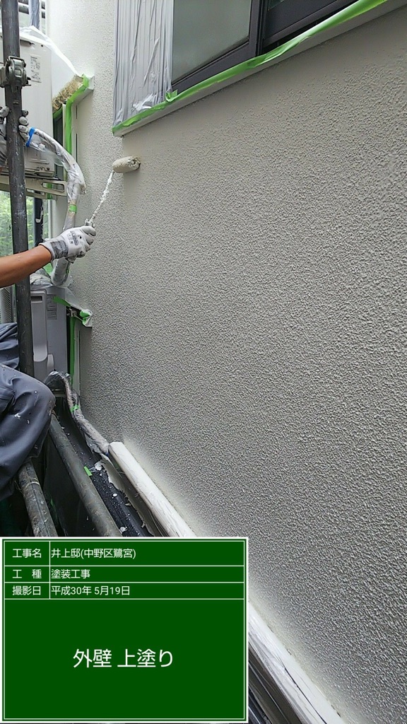 外壁上塗りの前日続きです。パーフェクトトップND155にて塗装。