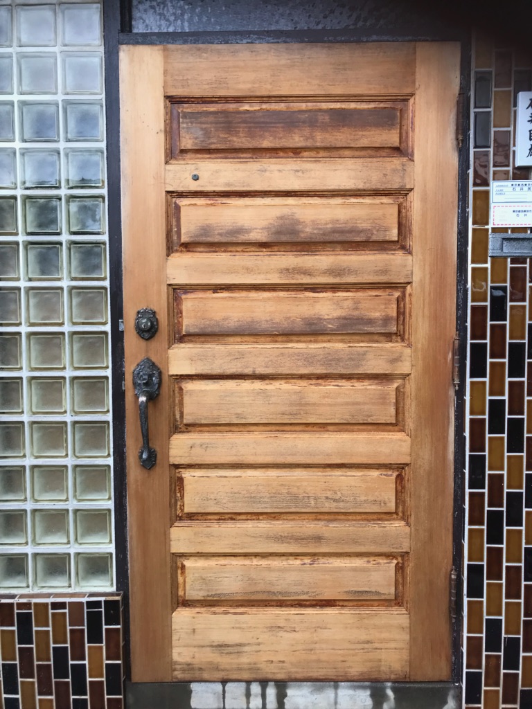 玄関ドアの剥離作業。薬剤を使い既存の塗幕を剥離します。