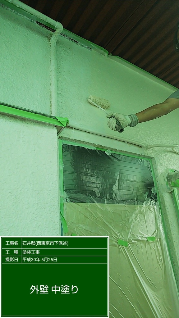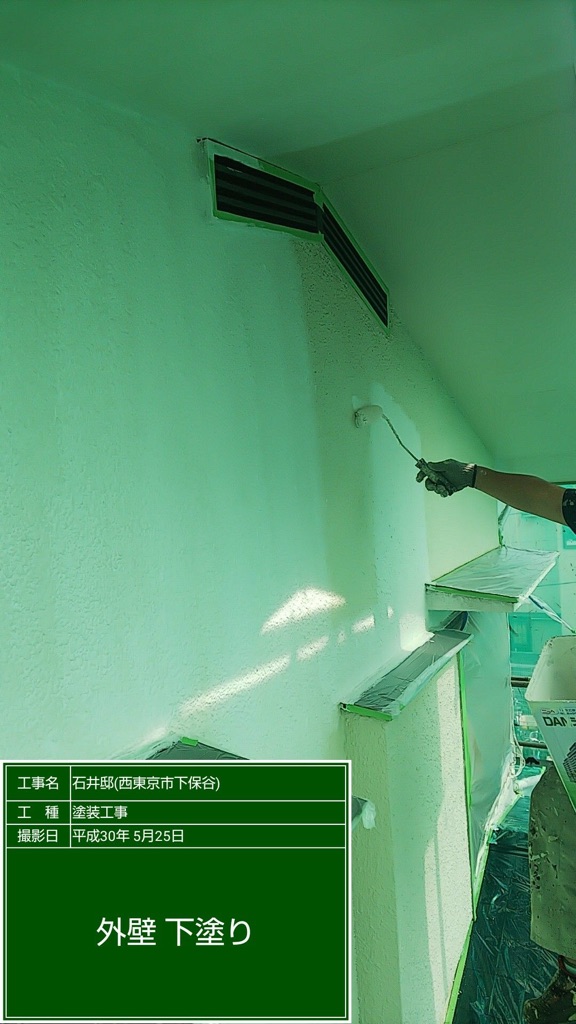 外壁下塗りフィーラー塗装。及び中塗り セラミクリーン色番号SR175にて塗装。