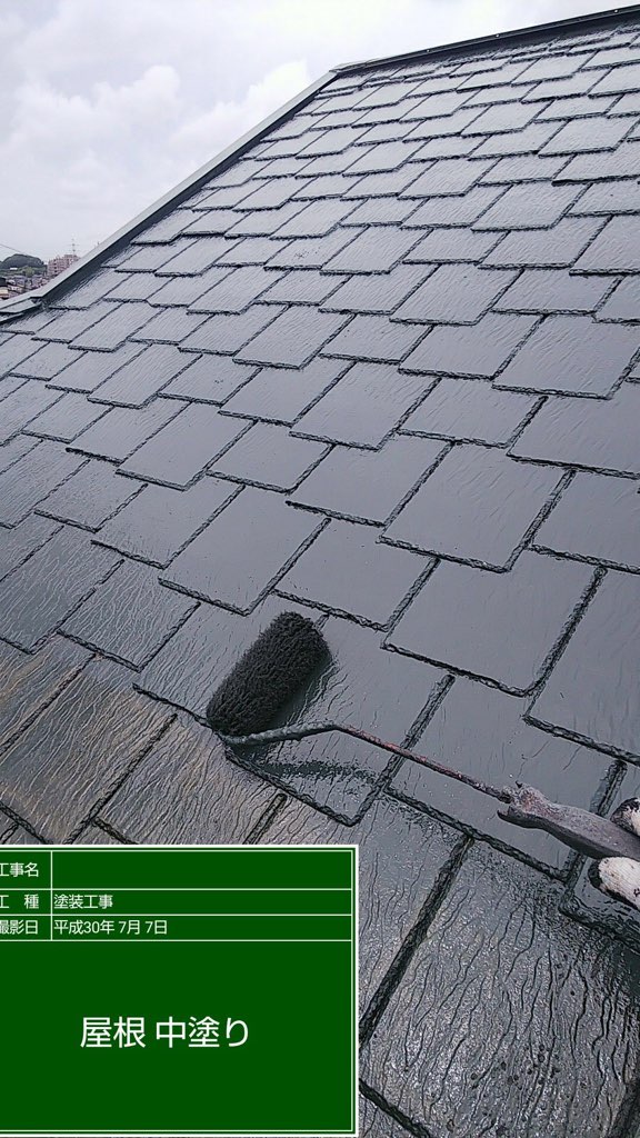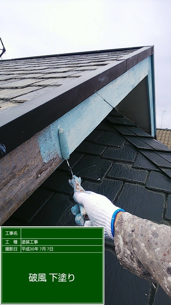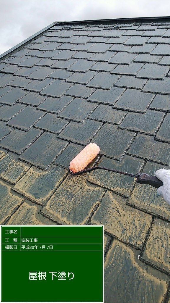 コロニアル屋根の下塗プライマー塗装。及びヤネフレッシュによる中塗り塗装。