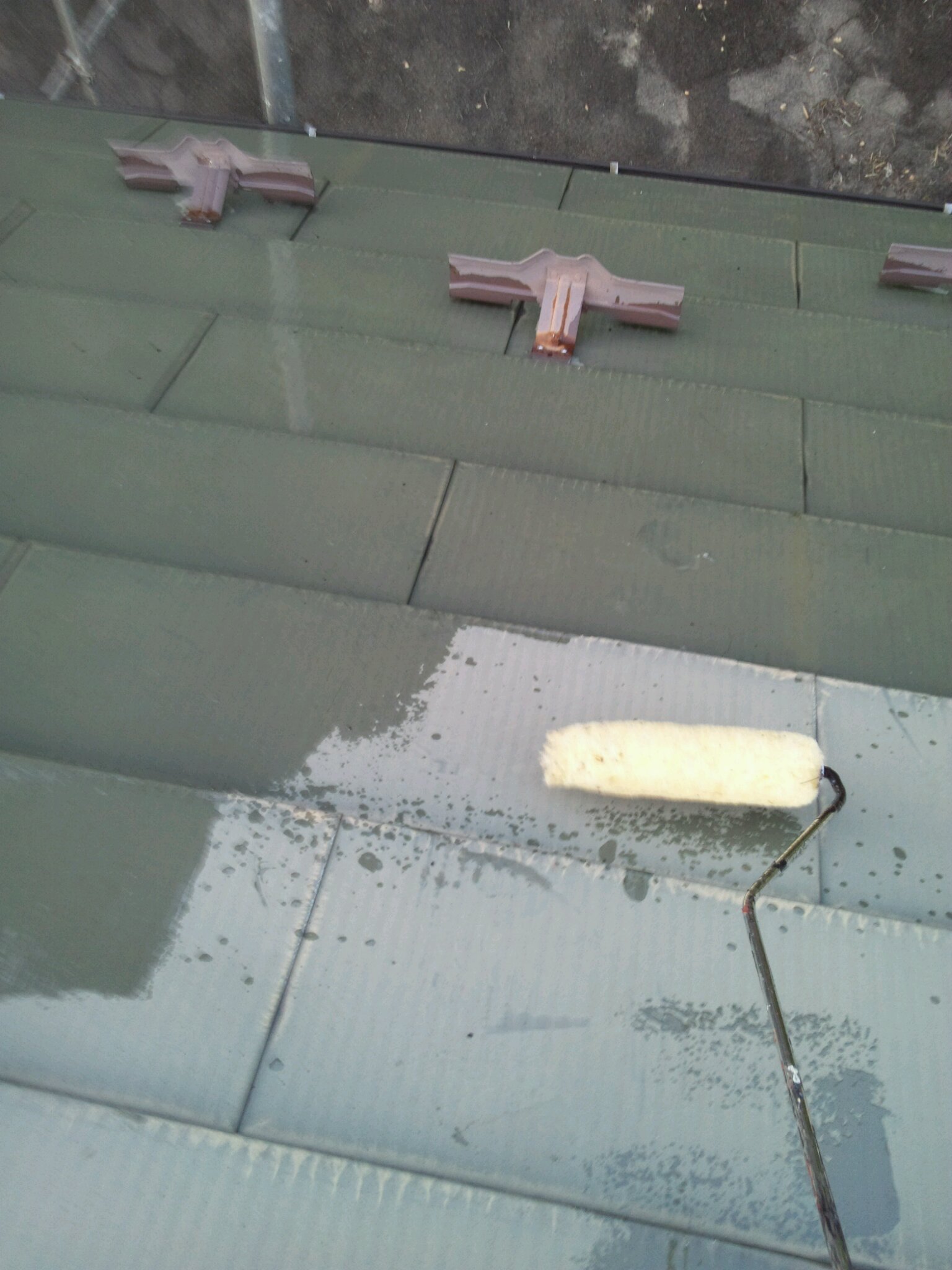 屋根のプライマーも塗装いたしました。(写真ではご紹介いたしておりませんが、トタンでも一部の物はプライマーを下塗りしないと剥がれる物があります)