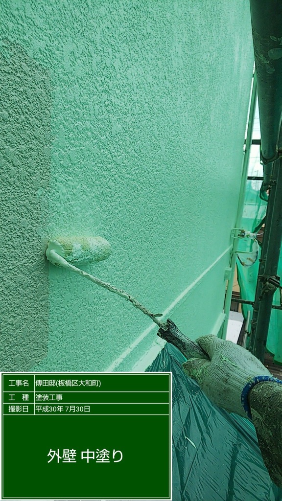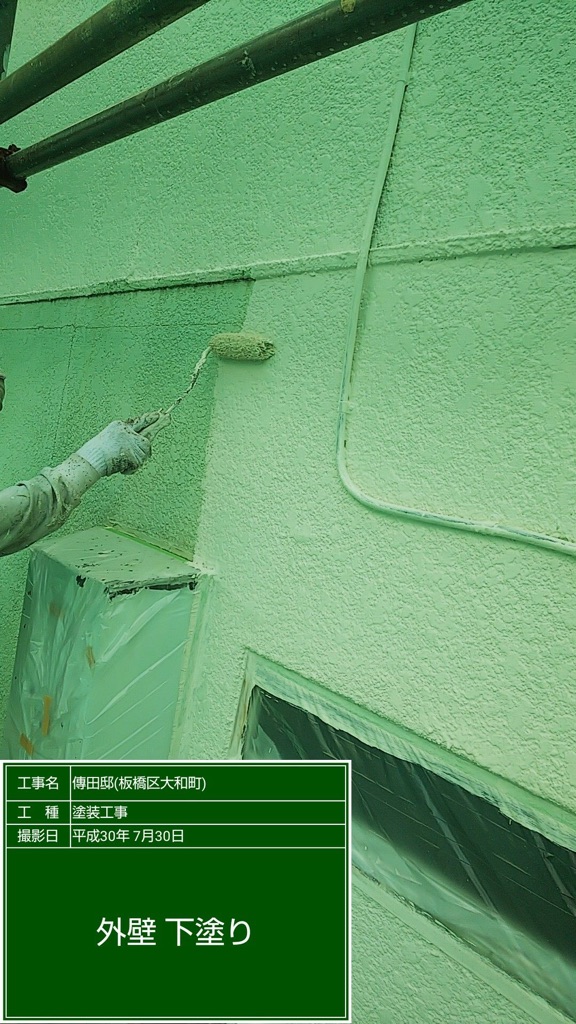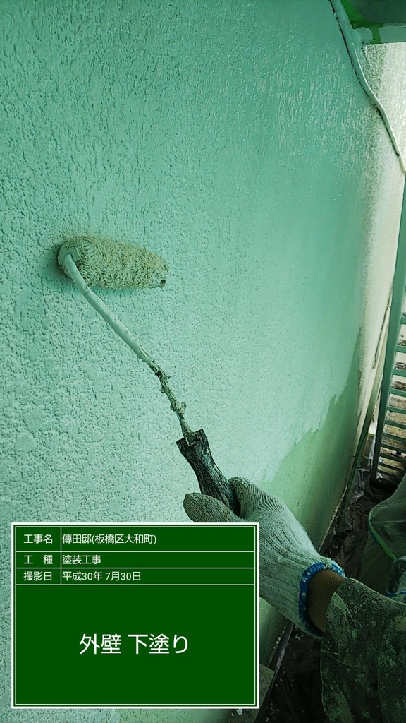 外壁下塗りフィーラー塗装。及び中塗り塗装 パーフェクトトップ 色番号37-90D。