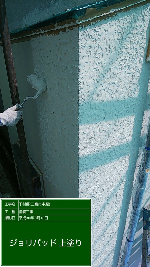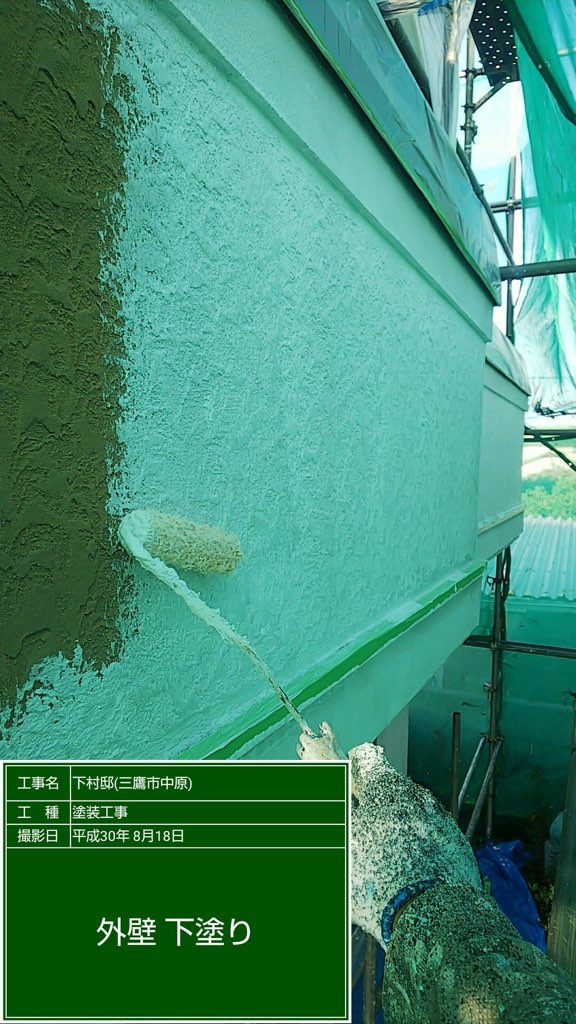 外壁 下塗りフィーラー塗装。及びモルタル部パターン付け塗装。