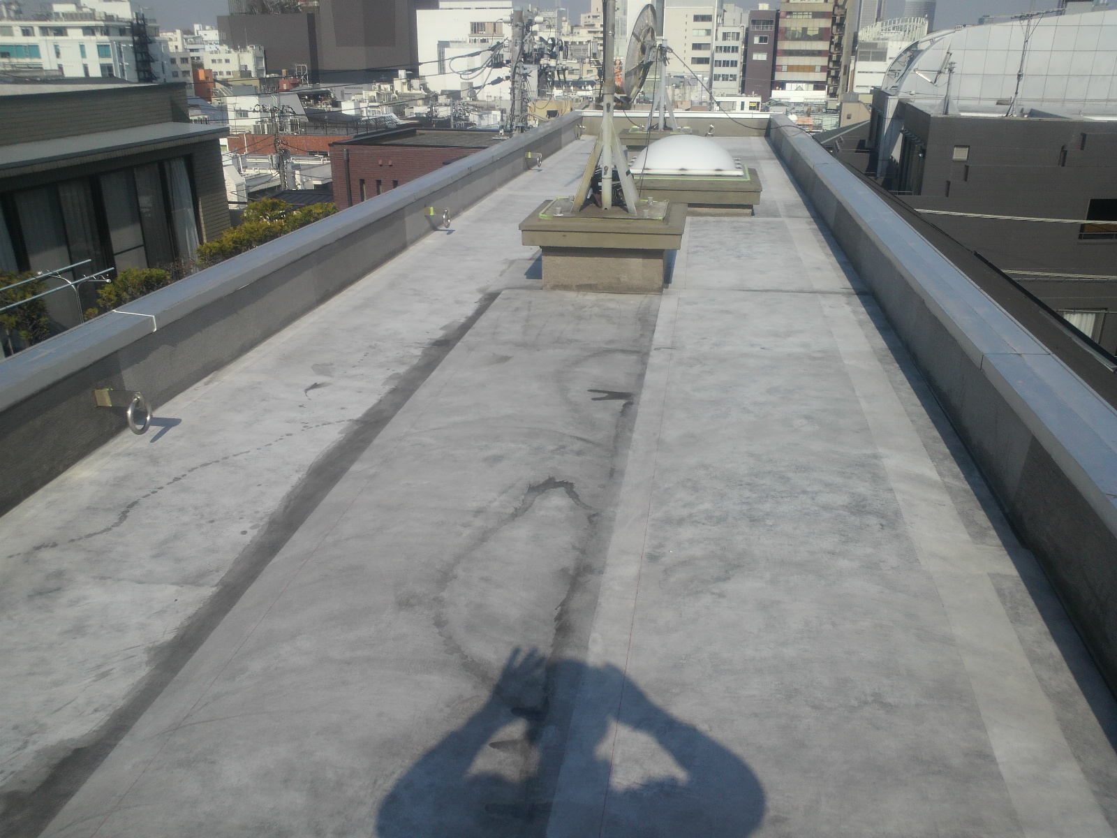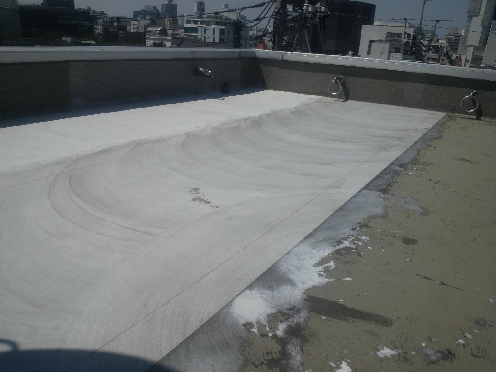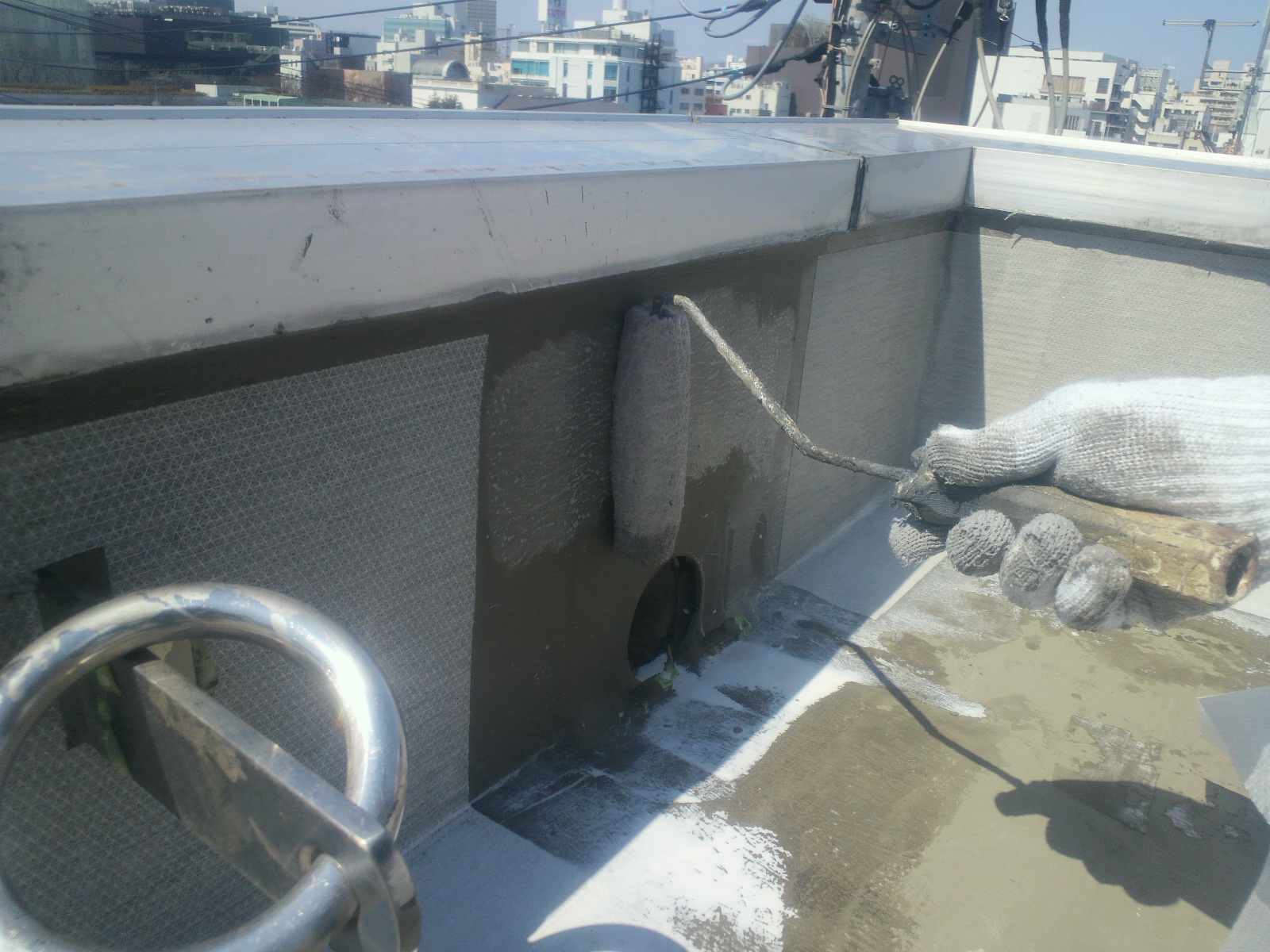 工事3日目はプライマー(下地と防水材を張り合わす接着剤のようなもの)入れと、防水マットです。これを入れる事により防水の強度を増します。入れるのと入れないで耐久性がかなり違いがでます。