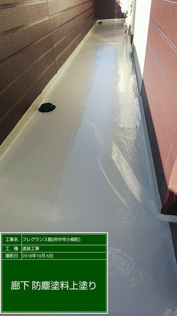 共用廊下の床塗装 プライマー塗布及びウレタントップコート塗装。