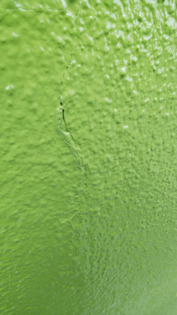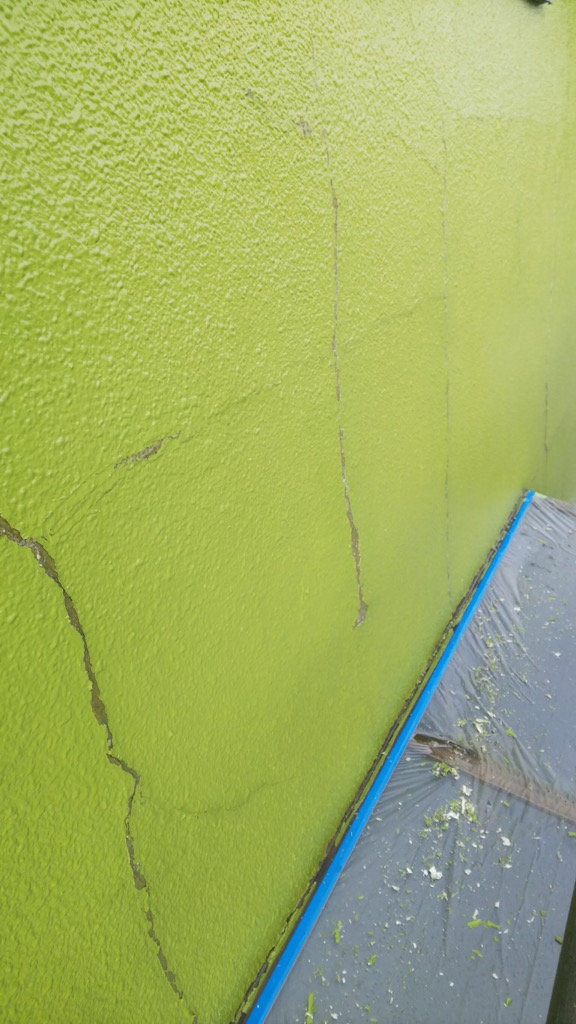 前回塗装の際にクラックの部分にシリコン系のコーキングを施工して、その上に多分処理なしに塗装をしたものと思われます。その部分が剥離して尚且つまたクラック発生によりその部分より漏水していると思われます。
