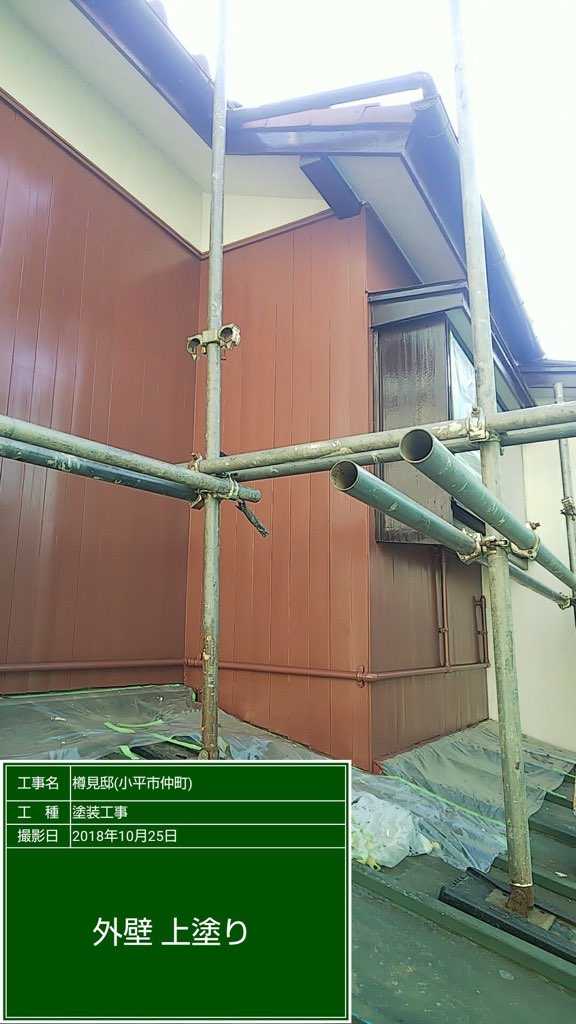 破風板、一部木枠及びトタン 塗装 マイルドシリコン ココナツブラウン色。