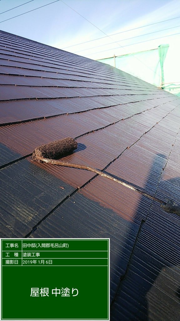 コロニアル屋根 中塗り塗装 ヤネフレッシュ ココナツブラウン色。
