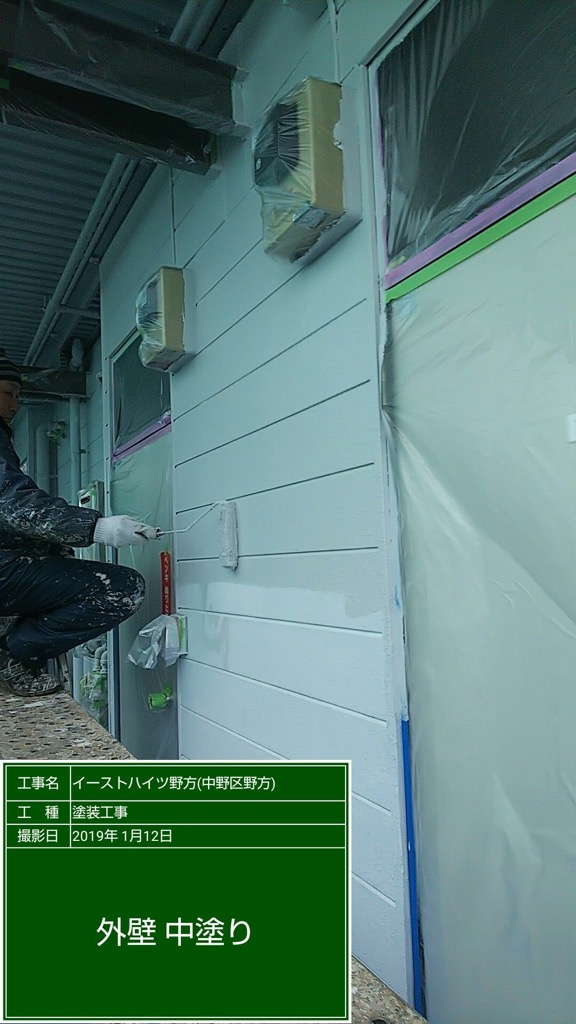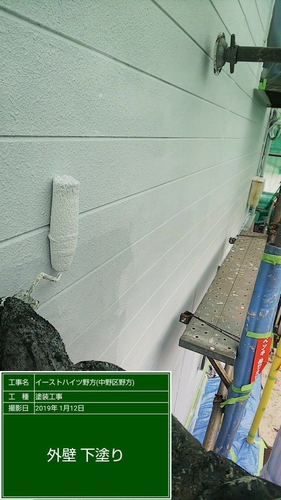 外壁 下塗りフィーラー塗装及びセラミクリーン 色番号N80中塗り塗装。