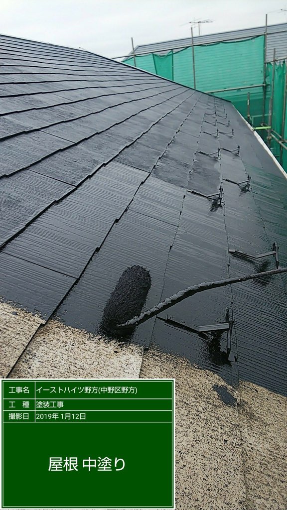 コロニアル屋根 中塗り ヤネフレッシュ 黒色塗装。