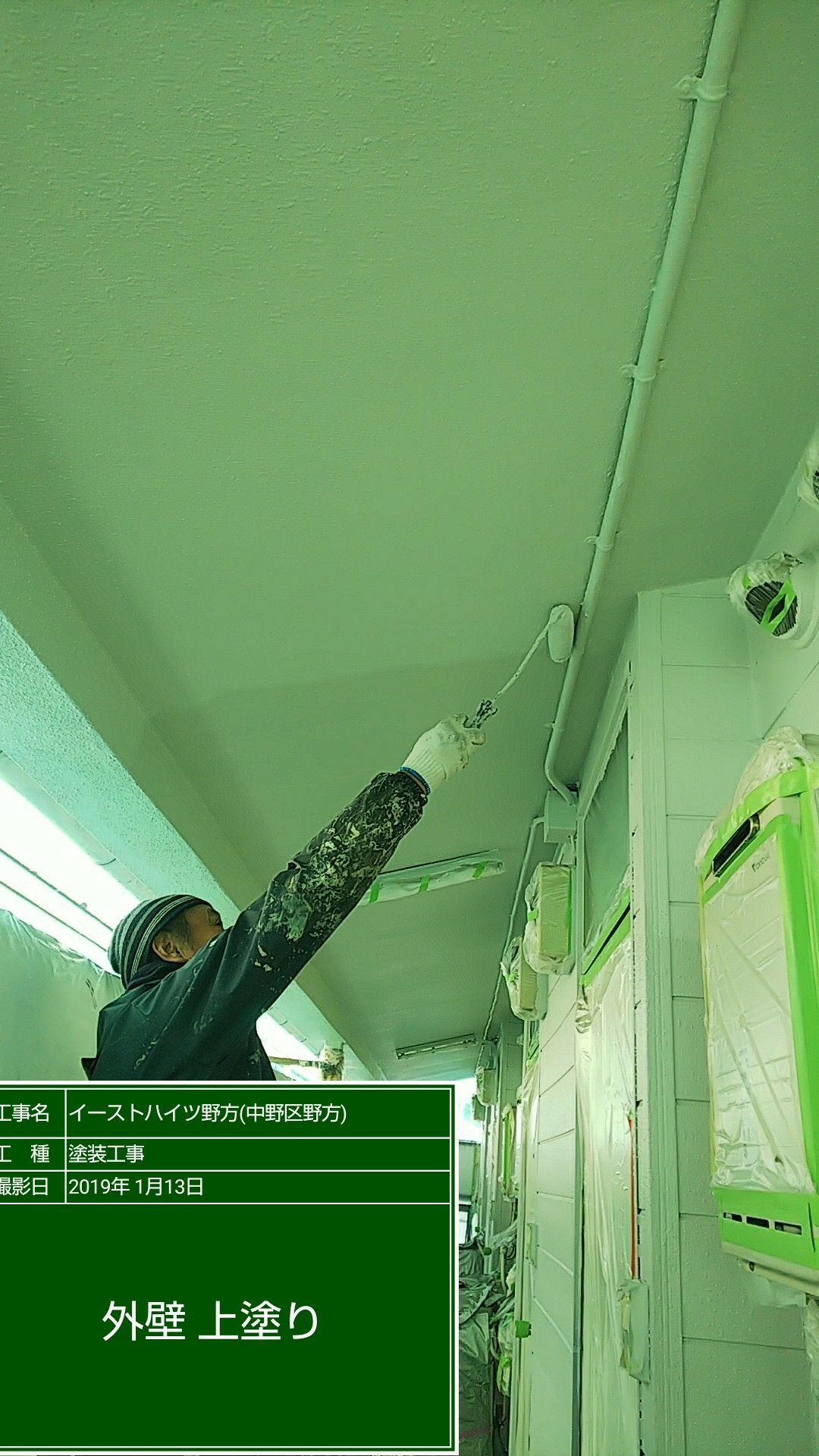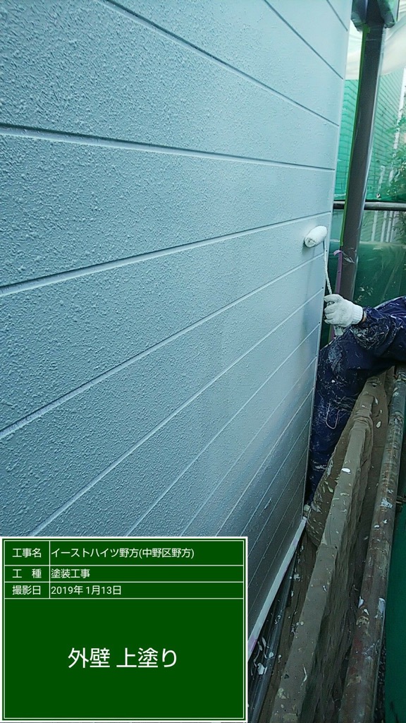 外壁 中塗りの続き塗装。上塗り セラミクリーン塗装。