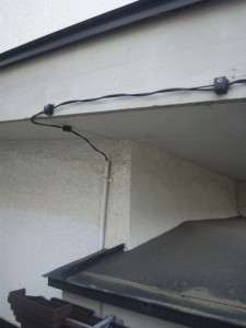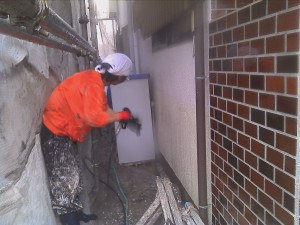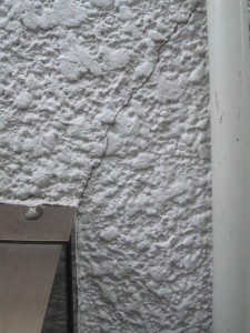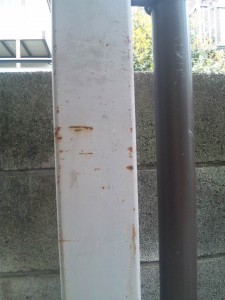 外壁がクラック(ひび)があり、トタンの霧除け(庇)も藻などが生えている。鉄骨もサビがでていました。