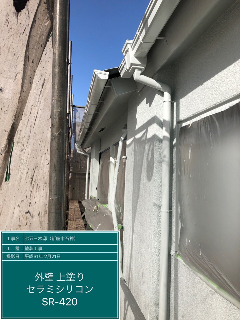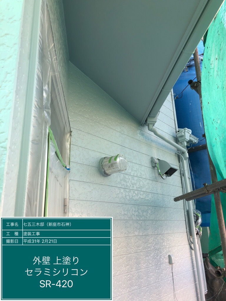 サイディング部の中塗り及び上塗り塗装、モルタル部の上塗り塗装をいずれもセラミシリコン 色番号SR420