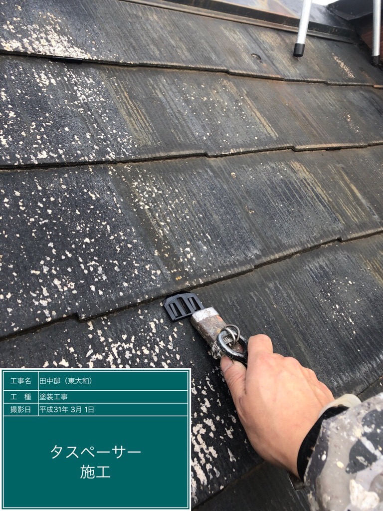 コロニアル屋根はタスペーサー挿入工事及びプライマー塗装。