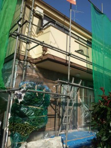 その後、サイディングとの境の帯を塗装したり、コーキングの補修、ベランダ床の塗装のプライマー塗り等をさせていただきました。
