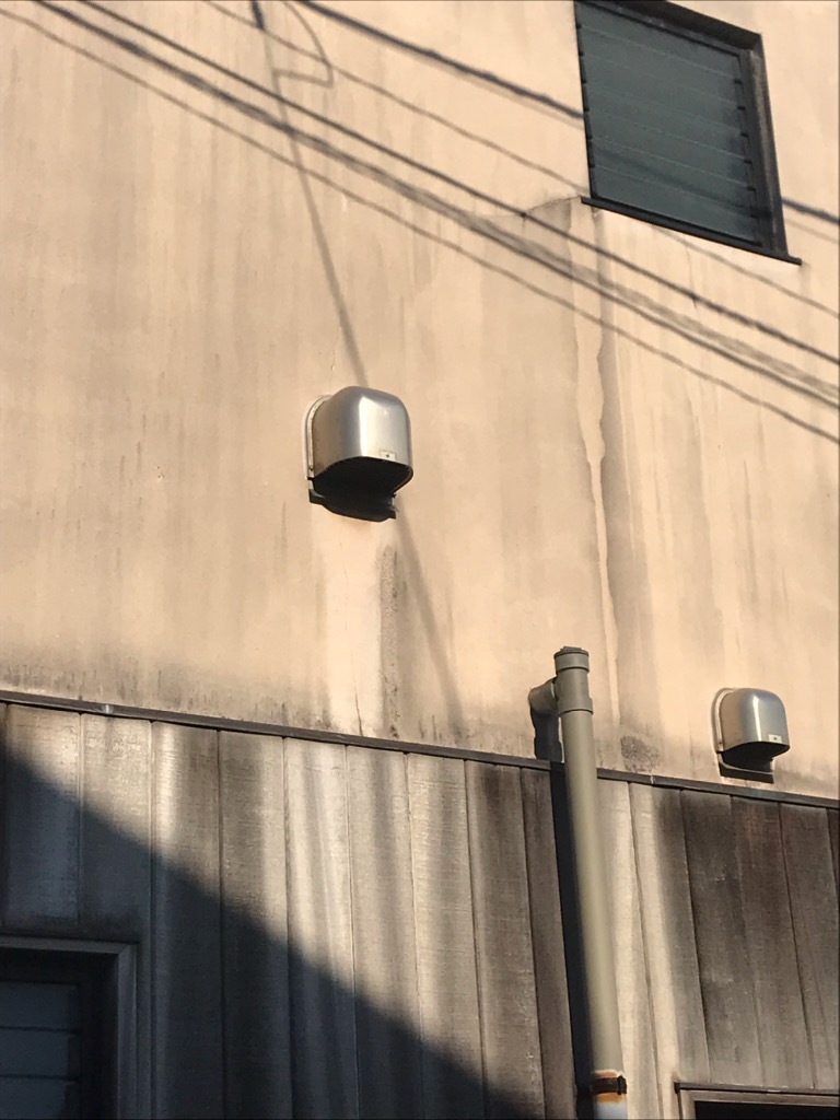 モルタル壁はかなりの劣化が見られます。汚れで黒ずんでいます。