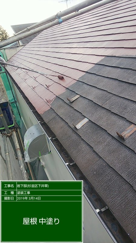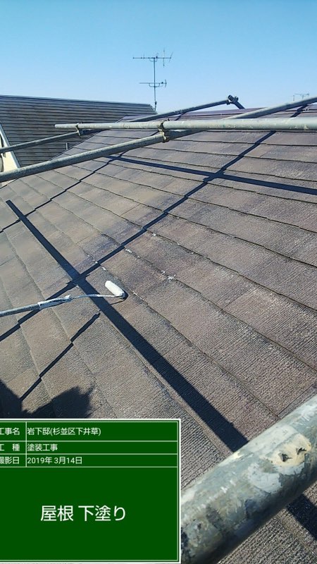 コロニアル屋根 プライマー塗装及びシリコンベスト ブラウン色にて中塗り塗装。