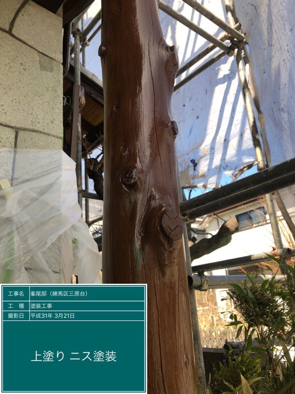 玄関柱の着色塗装、中塗りクリアー、仕上げクリアー塗装。