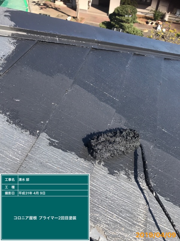大屋根 プライマー2回目塗装。中塗り及び上塗り(3~4回目)ファインパーフェクトベスト コーヒーブラウン色塗装。