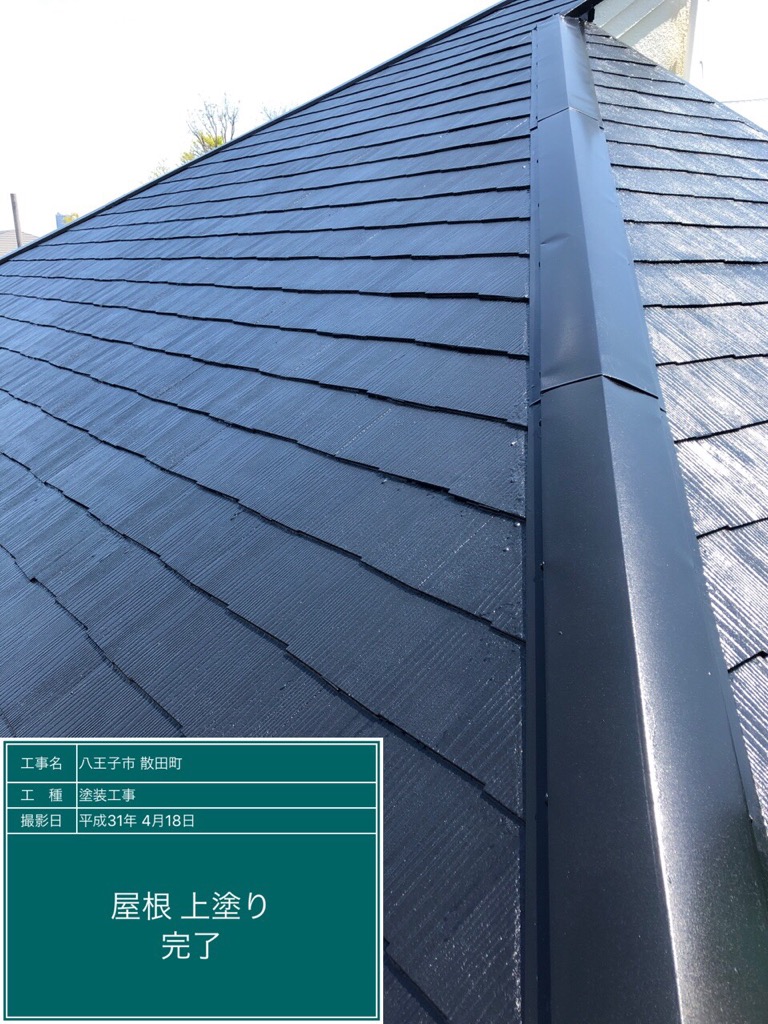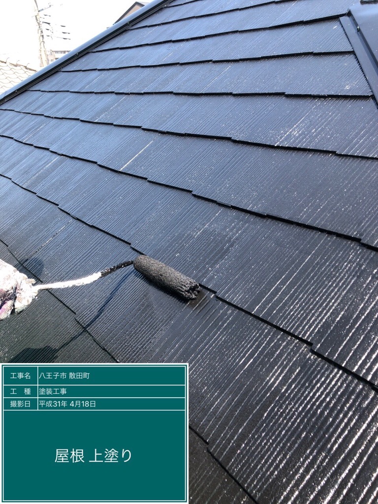 コロニアル屋根の中塗り及び上塗り塗装 黒色にて塗装。