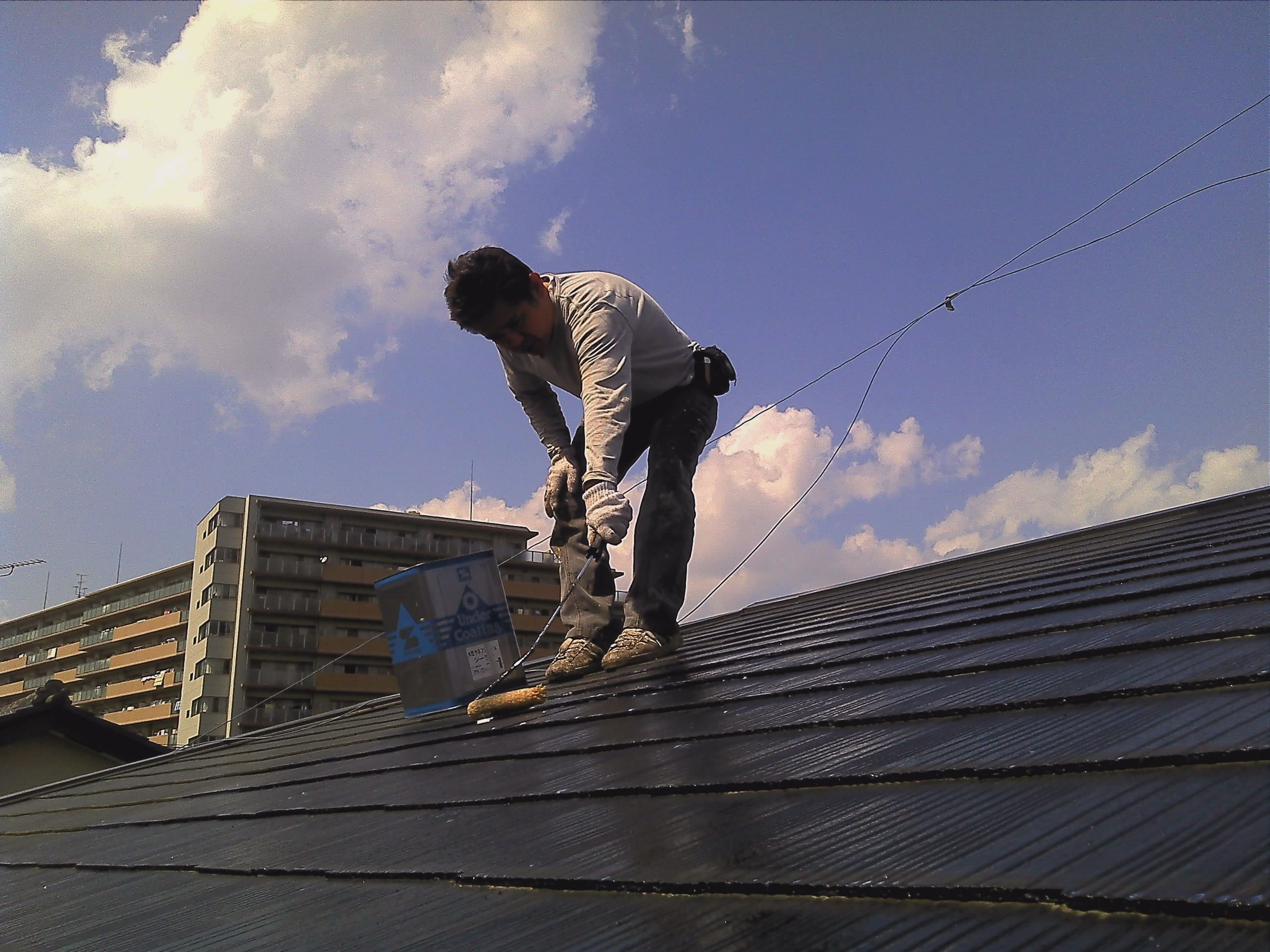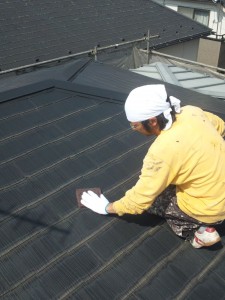 コロニアル屋根もまずはけれん(コロニアルは高圧洗浄では落ちないコケや藻を人間がこすっておとします)して、それからプライマーの塗布(プライマーとは上塗りのものとの接着をよくするためのものです)これを塗らないと、あとで剥離をおこします。