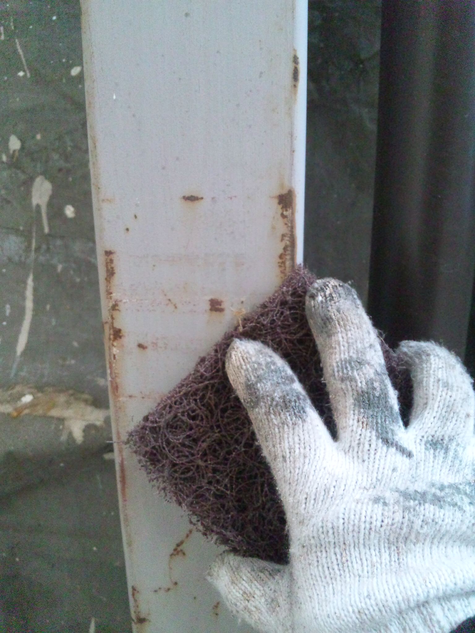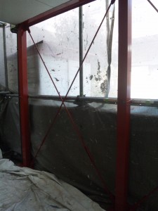 まずは下地処理から。鉄骨部分は充分にけれん(この場合はサビを落とし事)をして、それをさび止めをします。(最近の材料はほぼすべて乾きが早いものになってきています。当社使用のものは約1時間で乾燥します)